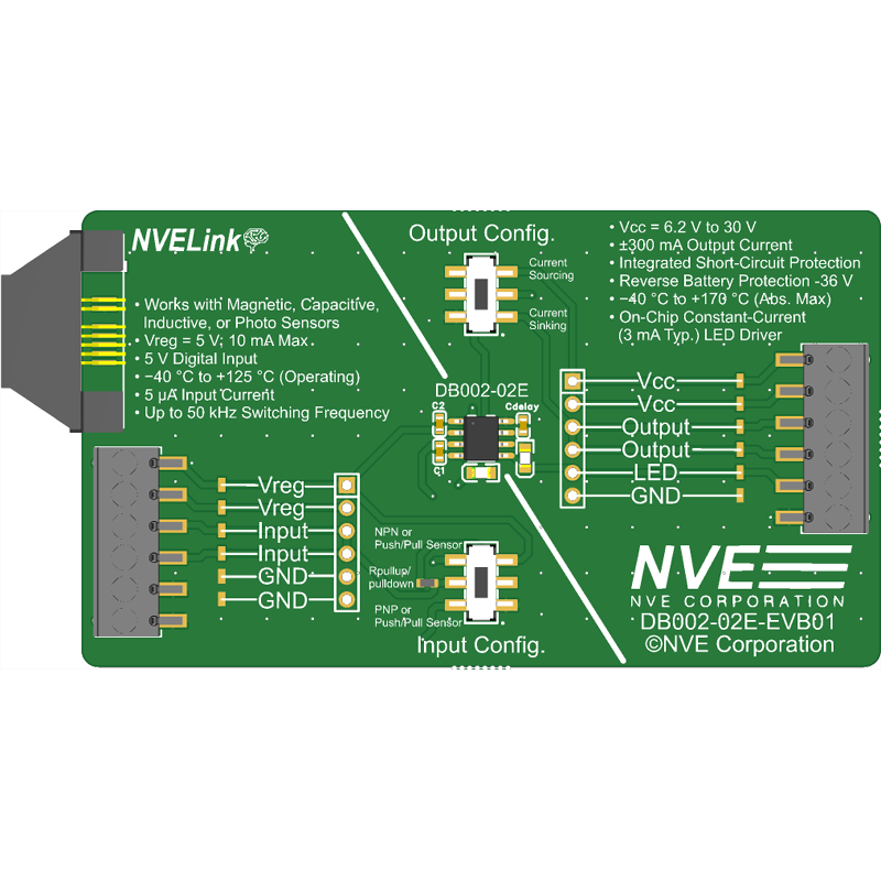 This board DB002-02 is designed to work with an AD122 GMR Switch or other current sourcing or CMOS/TTL digital output sensor element, such as an inductive sensor or a photo sensor. The DB002-02 functions as the front end of a complete sensor assembly, and includes protection against short circuits and high voltage transients from capacitive and inductive loads.